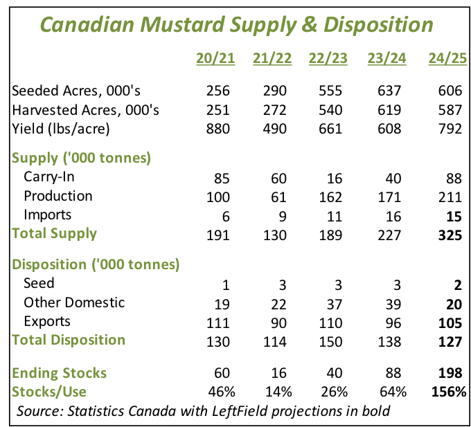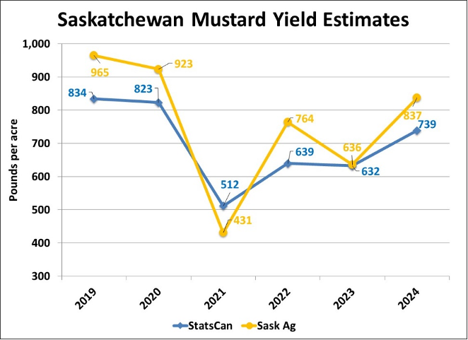 - En su estimación de rendimiento de principios de septiembre, Sask Ag mostró un rendimiento de la mostaza en 2024 de 842 lb/acre, pero luego bajó ese rendimiento a 688 lb/acre a finales de septiembre. Después, en su último informe sobre la cosecha de la temporada, Sask Ag elevó de nuevo el rendimiento de la mostaza a 837 lb/acre, casi 100 libras por encima del rendimiento de StatsCan para la provincia.