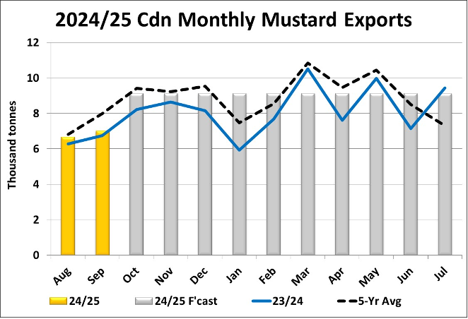 - Las exportaciones canadienses de mostaza mejoraron ligeramente en septiembre, hasta 7.000 toneladas, y se mantuvieron ligeramente por encima de las de hace un año, pero por debajo de la media de los últimos 5 años, de 8.000 toneladas. A pesar de los aranceles de la UE sobre la mostaza rusa, las exportaciones canadienses a Europa cayeron por debajo de las 1.400 toneladas en septiembre, el nivel más bajo del mes desde 2015/16. En el lado positivo, las 4.550 toneladas exportadas a EEUU supusieron una sólida mejora respecto a hace un año. Aunque normalmente las exportaciones empiezan el año con una nota más lenta, nuestra previsión de exportaciones para todo el año de 105.000 toneladas ya parece un poco optimista, pues requeriría que las exportaciones mensuales alcanzaran una media de 9.100 toneladas durante el resto del año, muy por encima del ritmo del año pasado.