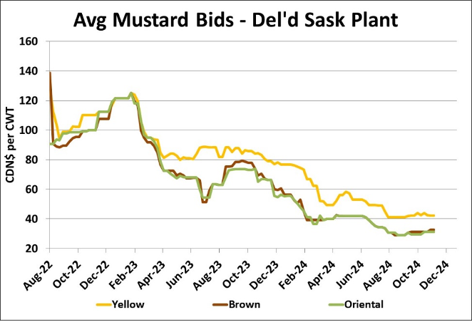 Las ofertas de mostaza se han mantenido planas en el oeste de Canadá, ya que los nuevos negocios son muy limitados. Al mismo tiempo, los agricultores no están vendiendo activamente. En este tipo de entorno, los precios anunciados son en su mayoría meras indicaciones, más que ofertas reales en vivo. La gran cantidad de suministros en 2024/25 limitará cualquier potencial alcista, y es probable que este débil entorno de precios se prolongue hasta 2025/26.