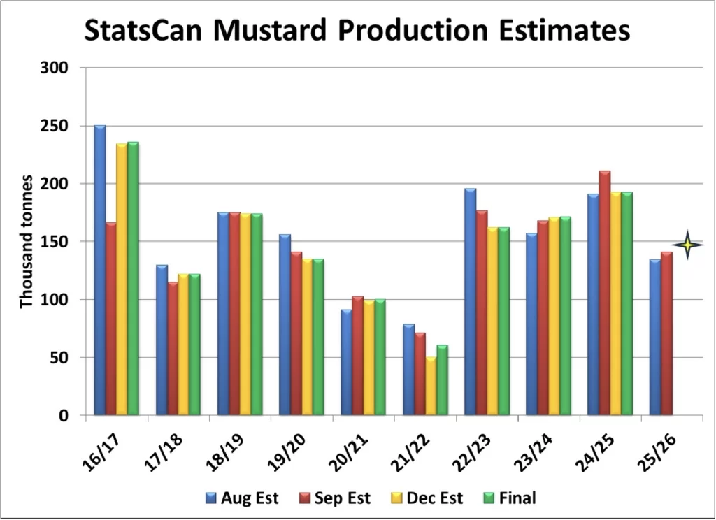 - StatsCanによる今週のマスタード作柄予想は、9月のモデルベースの数字14万1,000トンからそれほど動かないかもしれない。今 回 の 見 通 し は 農 家 調 査 に 基 づ い て い る た め、若干控えめになる可能性がある。前回の予想生産量は 145~15 万トンで、播種面積が 40%減少したため、昨年より 24%減少した。