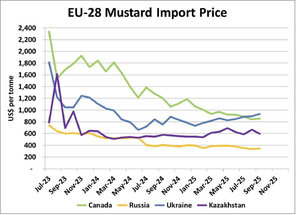 - ここ数ヶ月、EUからのカナダ産マスタードの輸入量は、トン数、市場シェアともに増加している。カナダ産マスタード価格が他産地のマスタードと競合できるほど下落した今、これは驚くべきことではない。実際、ウクライナのマスタード価格が上昇傾向にあることを示唆するならば、カナダ産ブラウンマスタードはもう少し上昇する可能性がある。また、50%の関税にもかかわらず、ロシア産マスタードが大幅な値引きに助けられてヨーロッパに入荷し続けていることも注目に値する。現在、ロシア産マスタードの価格はカナダ産やウクライナ産の半額を大きく下回っている。