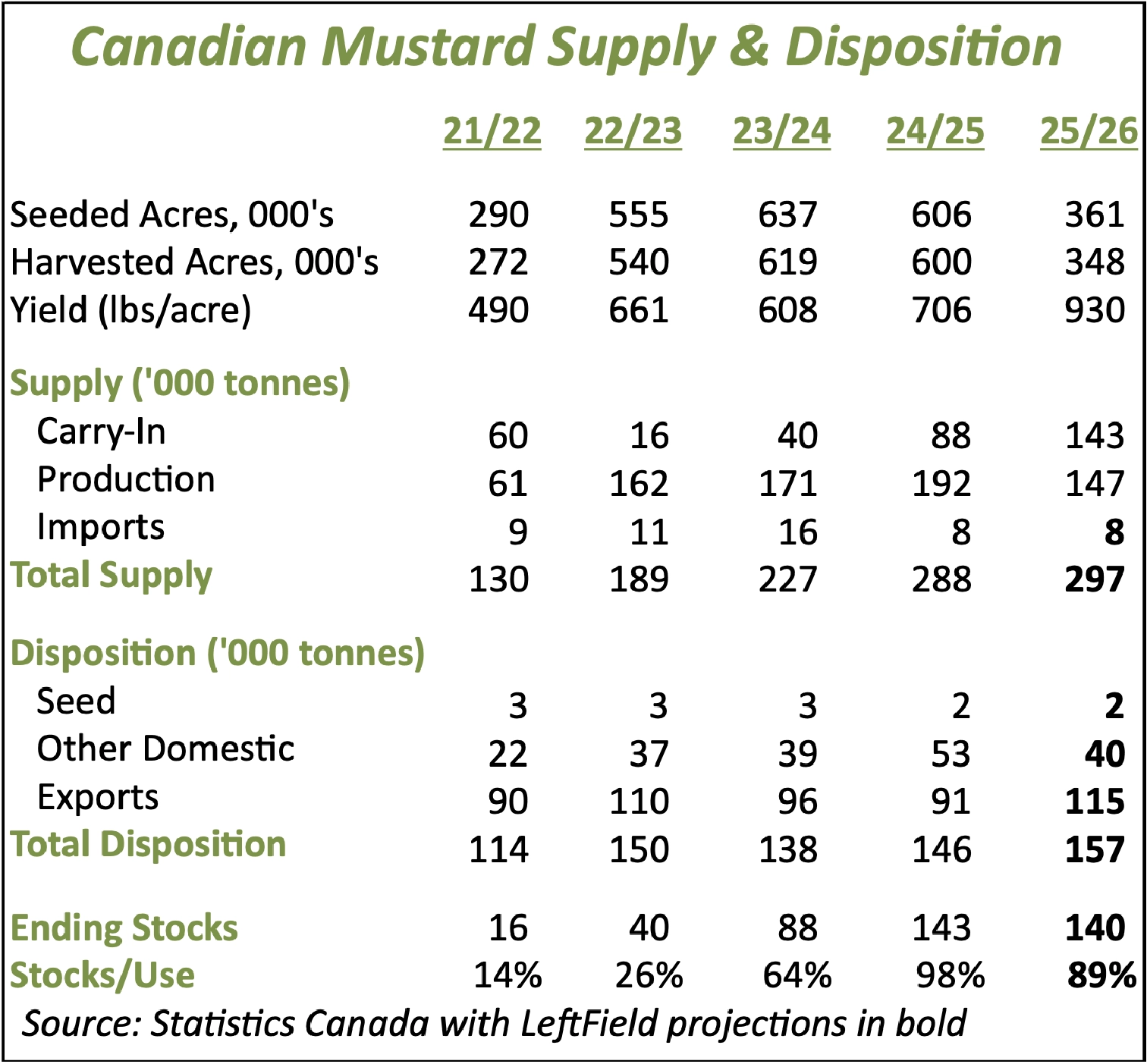 - とはいえ、生のトン数だけがすべてではなく、2025 年の作物品質の低下が供給状況の重要な要素である。Sask Agの品質内訳に基づくと、1Canおよび2Canマスタードの生産量は昨年より30%少ない115-120,000トンである。また、これは2024/25年産からの旧作キャリーオーバーの品質が悪いことに加えてのことである。