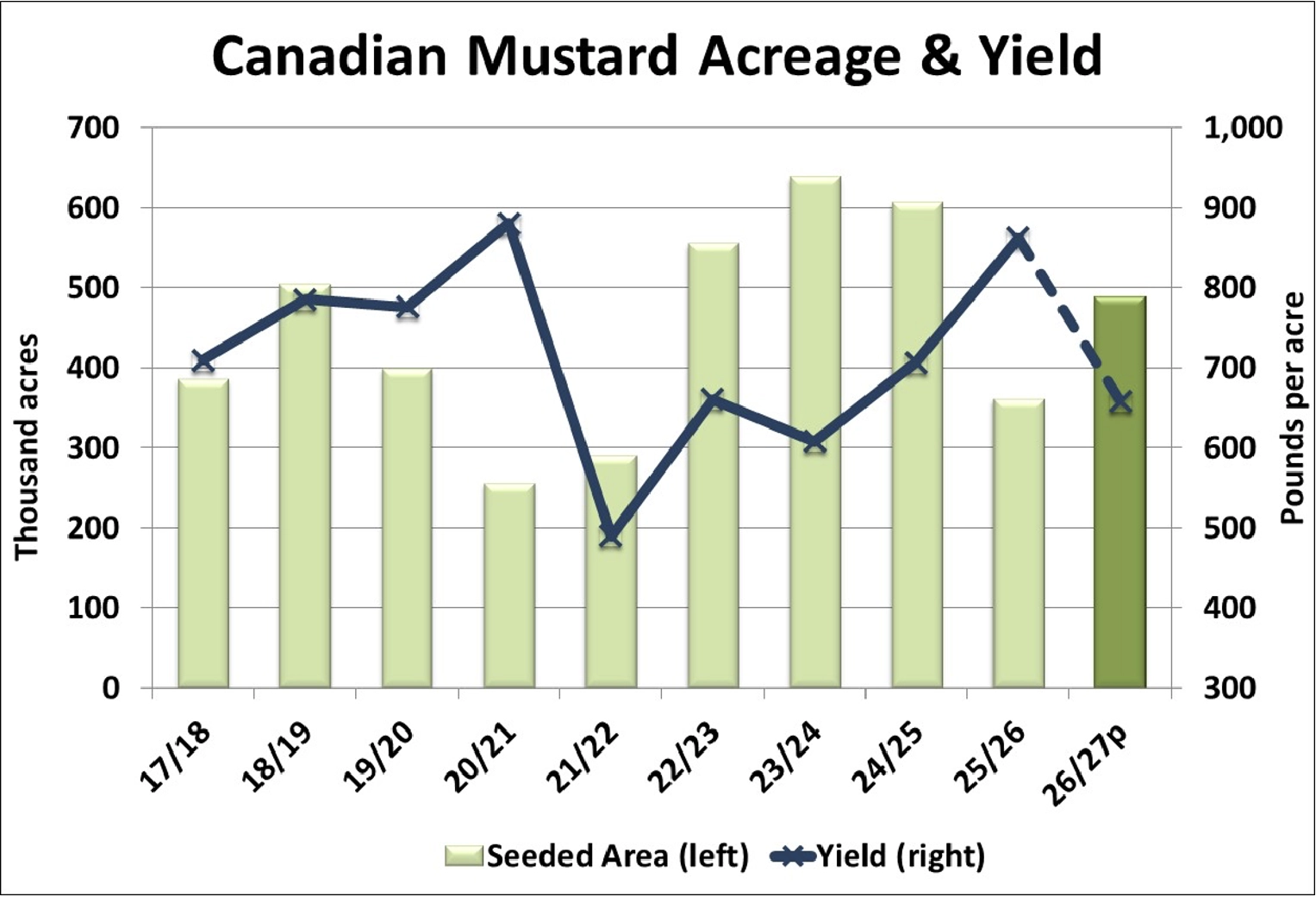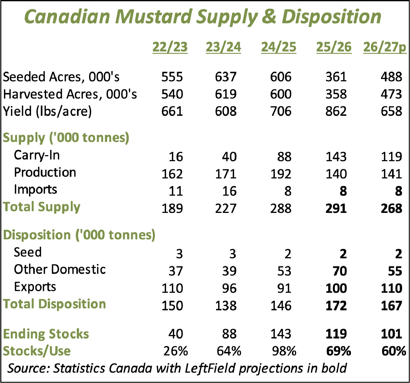 • Despite the large acreage increase, a drop in the overall mustard yield back to the olympic average of 658 lb/acre (862 last year) would mean the 2026/27 crop would end up at 141,000 tonnes, nearly unchanged from last year. A drop in old-crop carryover however, would mean lower supplies in 2026/27.