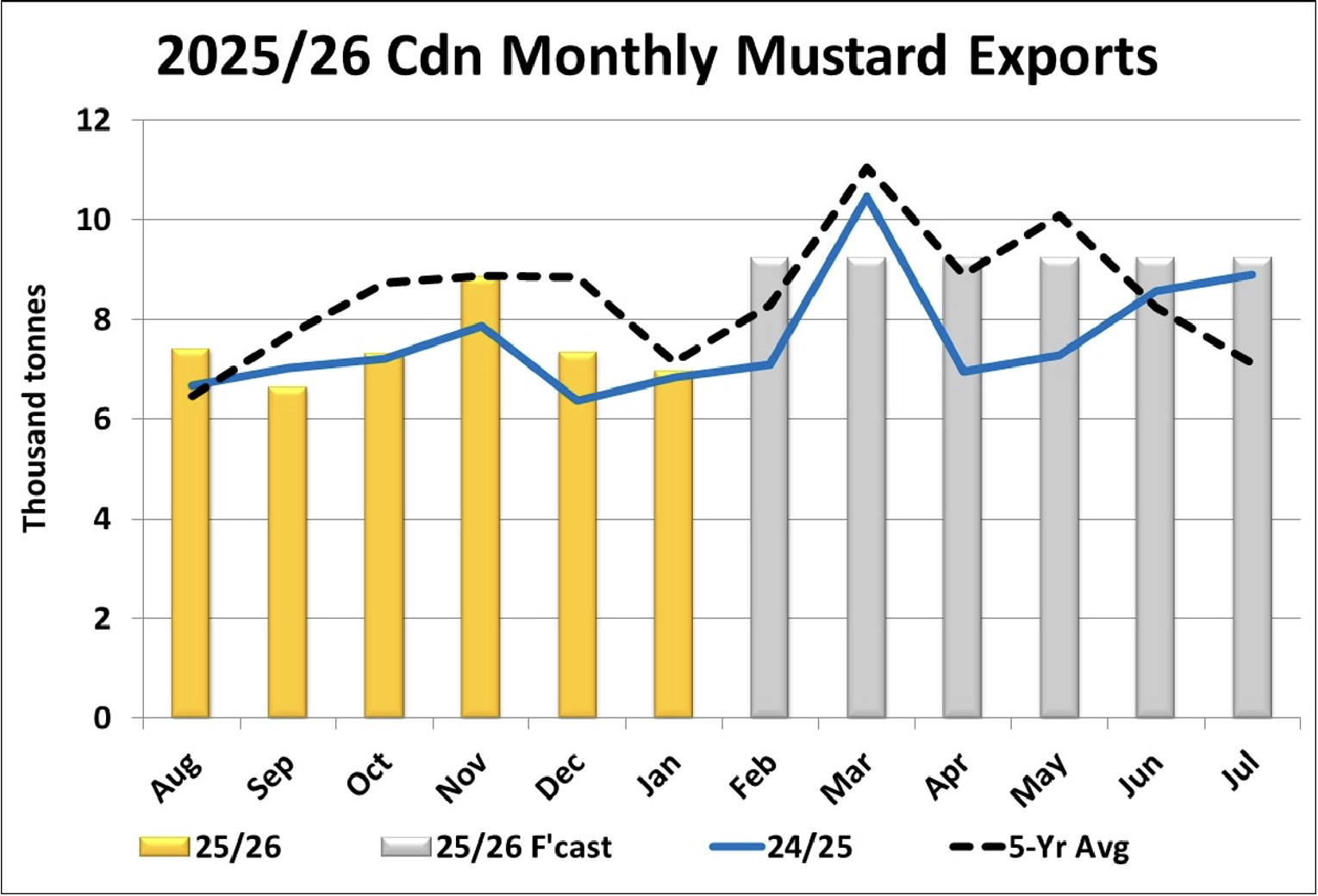 • Canadian mustard exports were disappointing again in January at just under 7,000 tonnes, marginally higher than last year but a bit below the 5-year average of 7,100 tonnes. Through the first half of 2025/26, exports are 44,600 tonnes, still ahead of the last two years but trailing the 5-year average of 47,700 tonnes. Exports to Europe are ahead of last year while volumes to the US are trailing. We’ve been concerned about mustard exports for a while and have now trimmed our full-year export forecast by 10,000 tonnes, now at 100,000 tonnes, still the highest since 2022/23. Exports tend to improve in the second half of the marketing year, and monthly volumes would need to average 9,200 tonnes for the final six months.