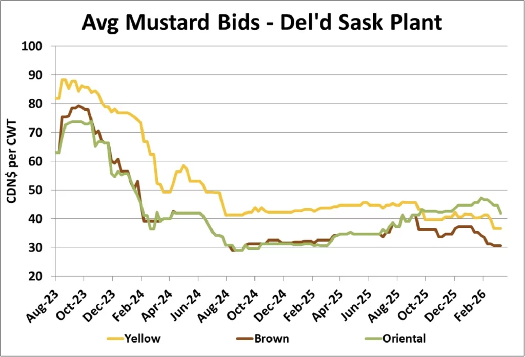 The lacklustre mustard exports are starting to exert a larger influence on mustard bids in western Canada. Even though supplies of good-quality mustard aren’t excessive, the market is feeling heavier due to the quieter demand. More downside risk is possible if farmer selling picks up in response to the lower bids. The new-crop market is still steady as the 2026/27 outlook seems to be fairly well-balanced.