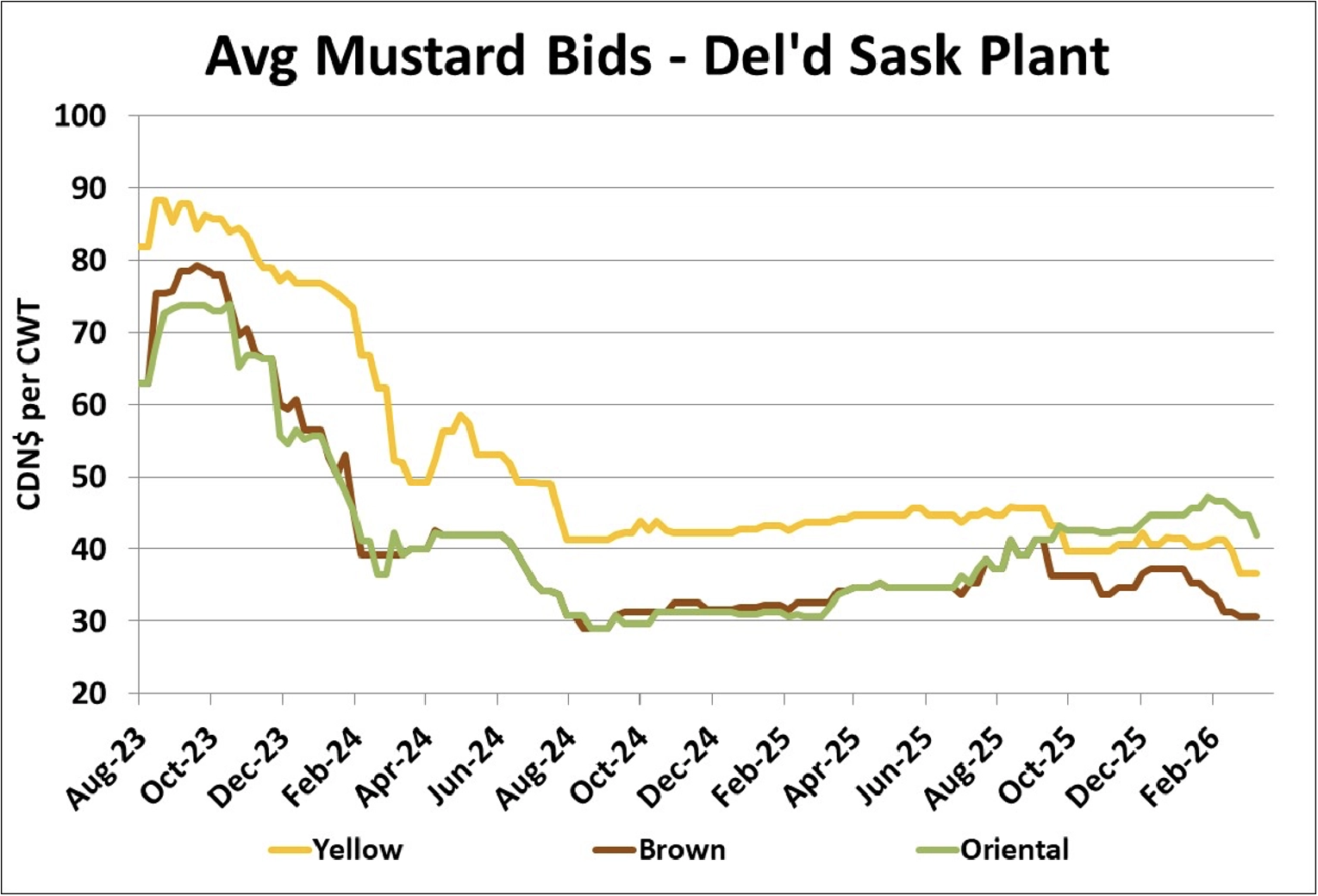 • Old-crop oriental mustard is continuing to decline from its peak in early February, which suggests that export demand has become quieter (or farmer selling has picked up or both). Old-crop yellow mustard bids have been gradually fading since early December while brown mustard bids remained flat in the last few months, although trade is less active. These weaker prices may be encouraging more farmer selling, which could add to the declines. New-crop bids are relatively steady, which suggests a more balanced outlook, although it’s still far too soon to draw conclusions.
